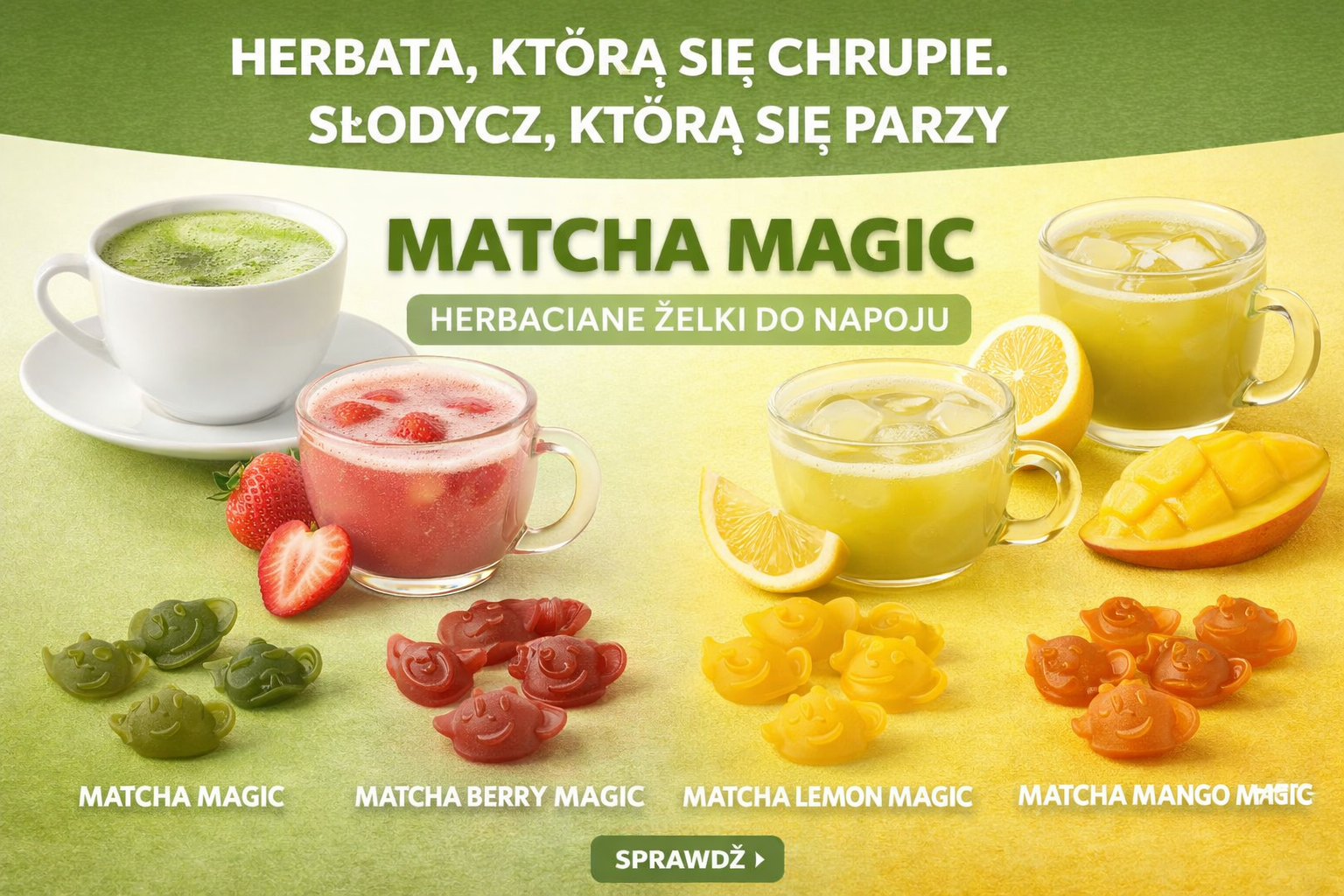 Brzmi jak żart, ale właśnie na tym polega pomysł nowej serii MATCHA MAGIC – herbacianych żelków, które można zjeść jak przekąskę albo zamienić w aromatyczny napój.