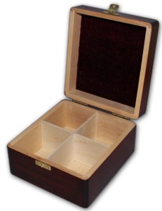 Kasetka na herbatę 4 jest wykonana z drewna i sklejki olchowej. Wnętrze kasetki podzielone jest na 4 pola.