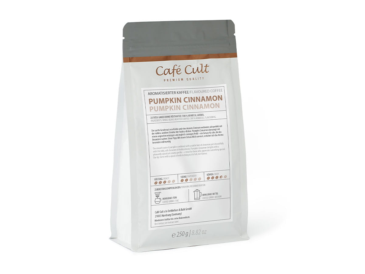 Kawa aromatyzowana Café Cult Pumpkin Cinnamon 250 g – 100% Arabica o smaku dyni i cynamonu. Aromatyczna, kremowa i idealna na jesienne dni.