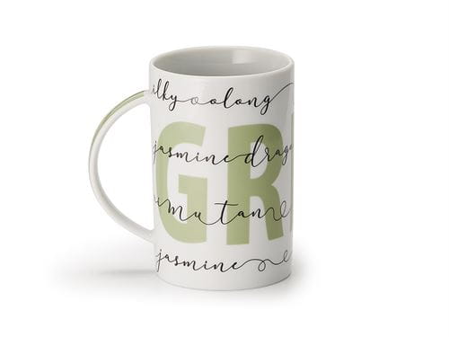 - napisy: czarny odręczny napis piórem z nazwami herbat dookoła kubka, zielony napis GREEN i rączka z paskiem w tym samym kolorze.