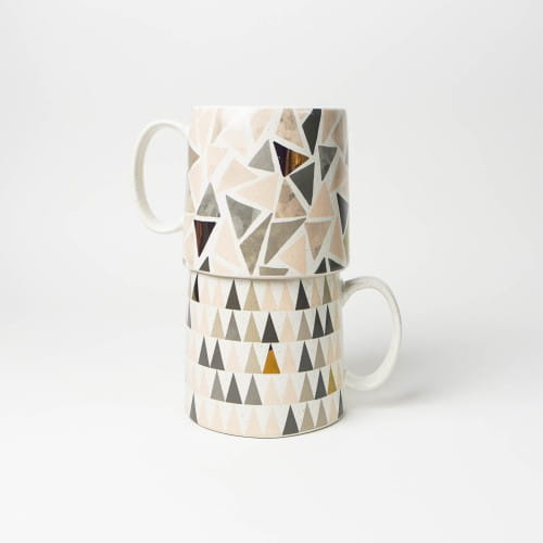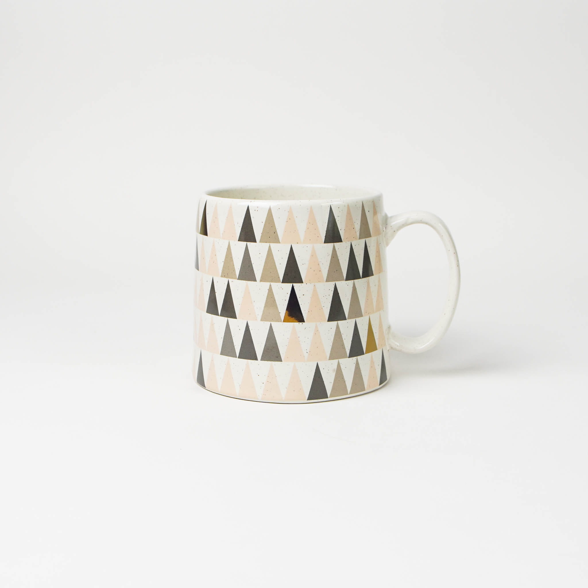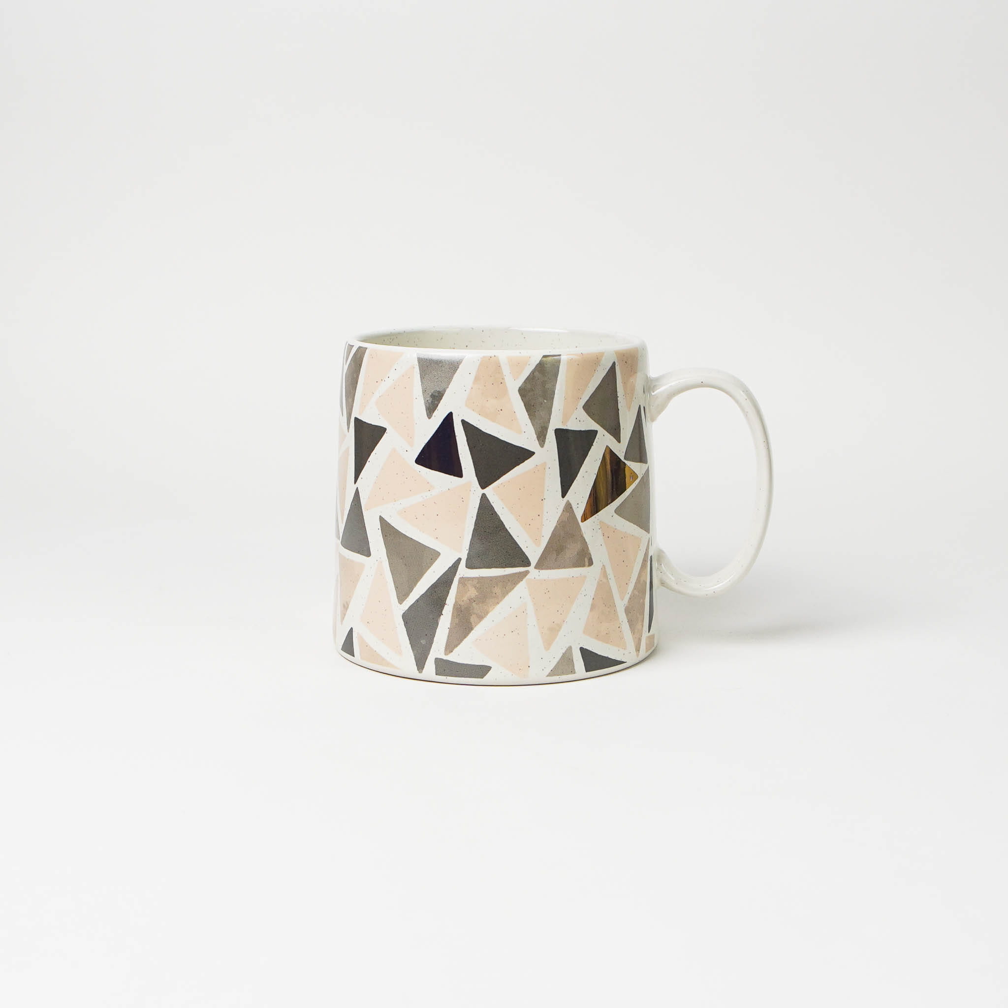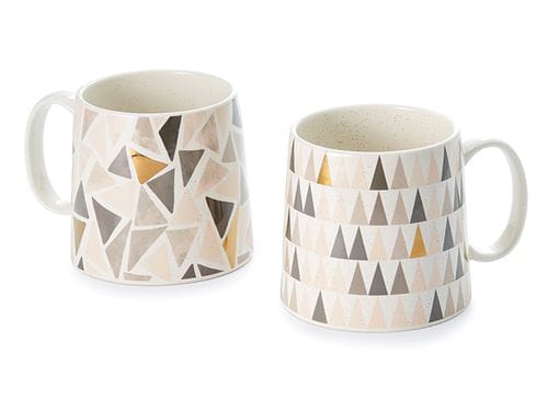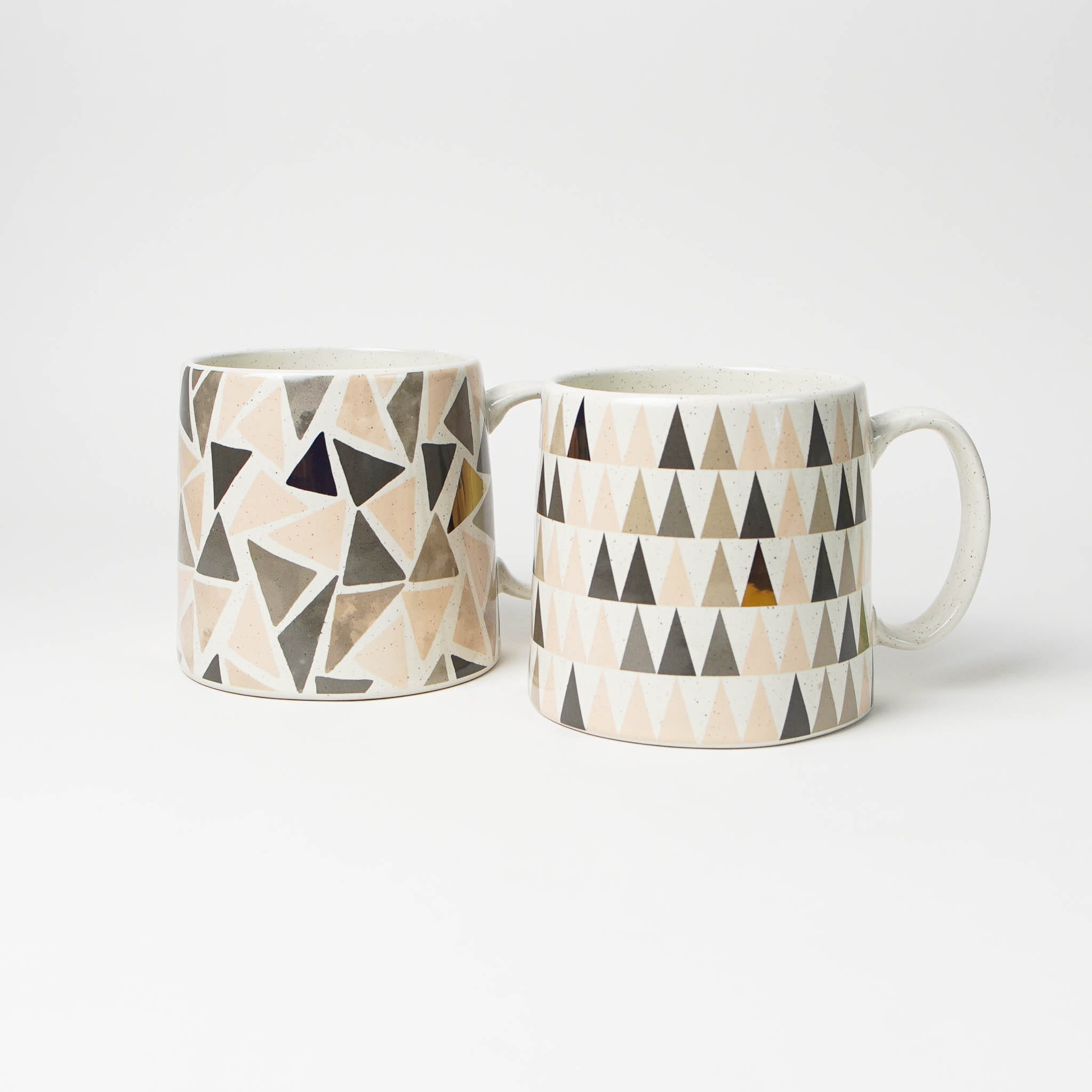 Ceramiczny kubek o pojemności 450 ml, w dwu wariantach kolorystycznych. Wzór to kształt odręcznie malowanych trójkątów w wersji regularnie rozmieszczonych i zmiksowanych pod różnymi kątami. Występują na nich elementy złocenia. Kolorystyka to szarości i kremy na białym tle z elementami złota.