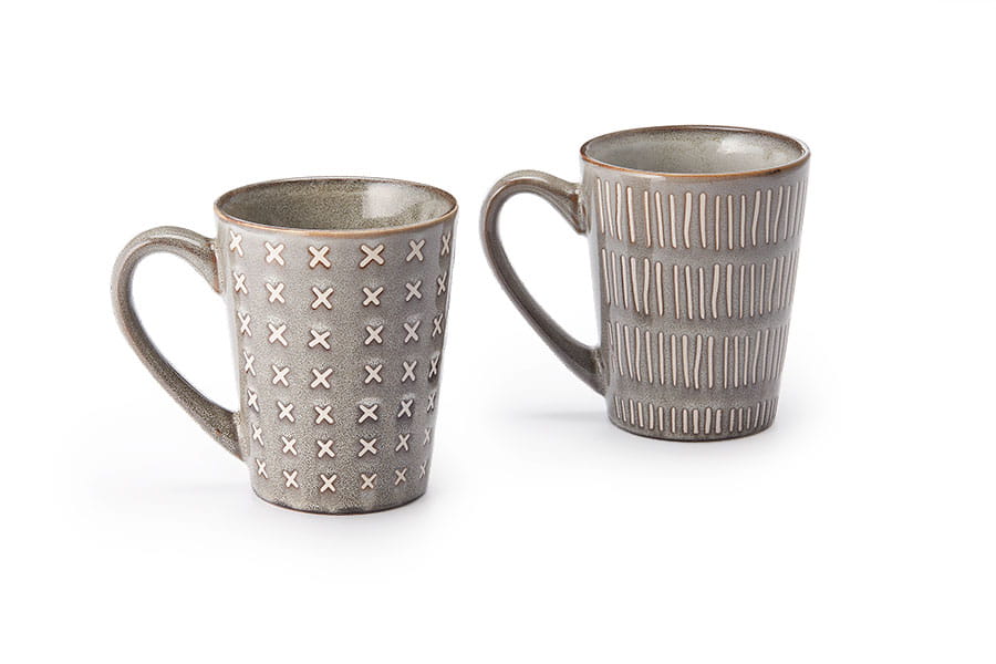 Wzór: szaro-brązowe z glazury, reliefy wypełnione białym szkliwem. 2 wzory reliefów: kreski i krzyżyki.