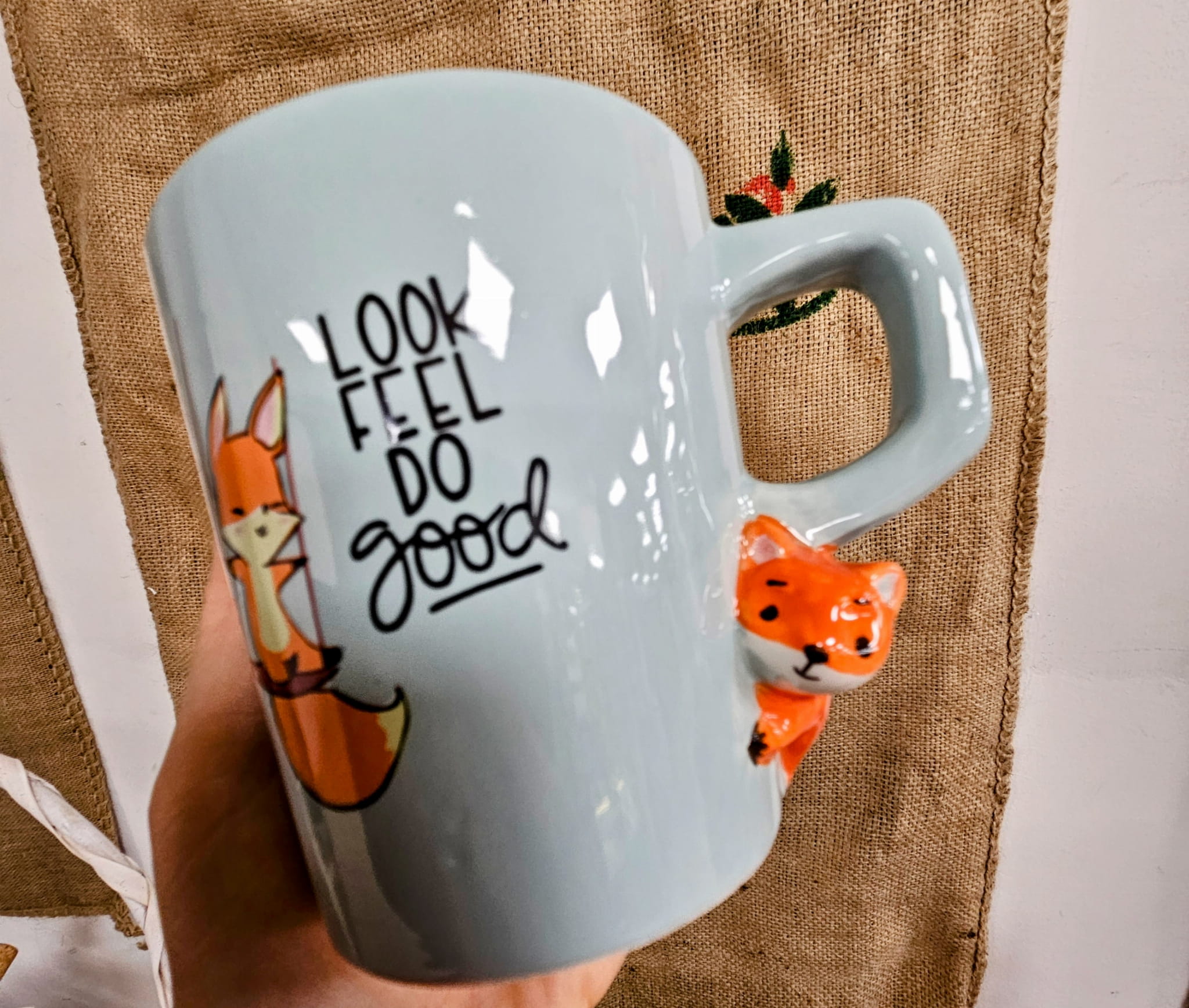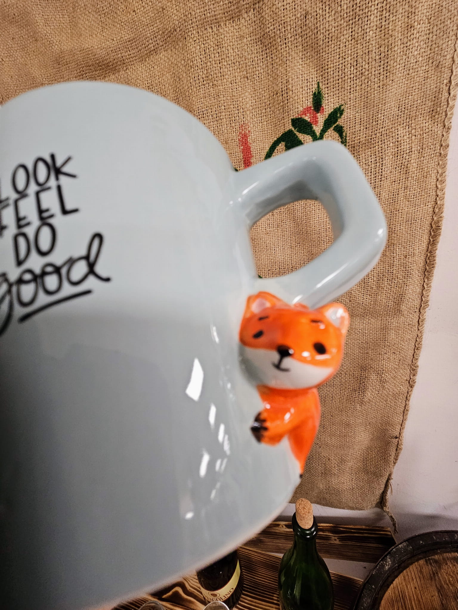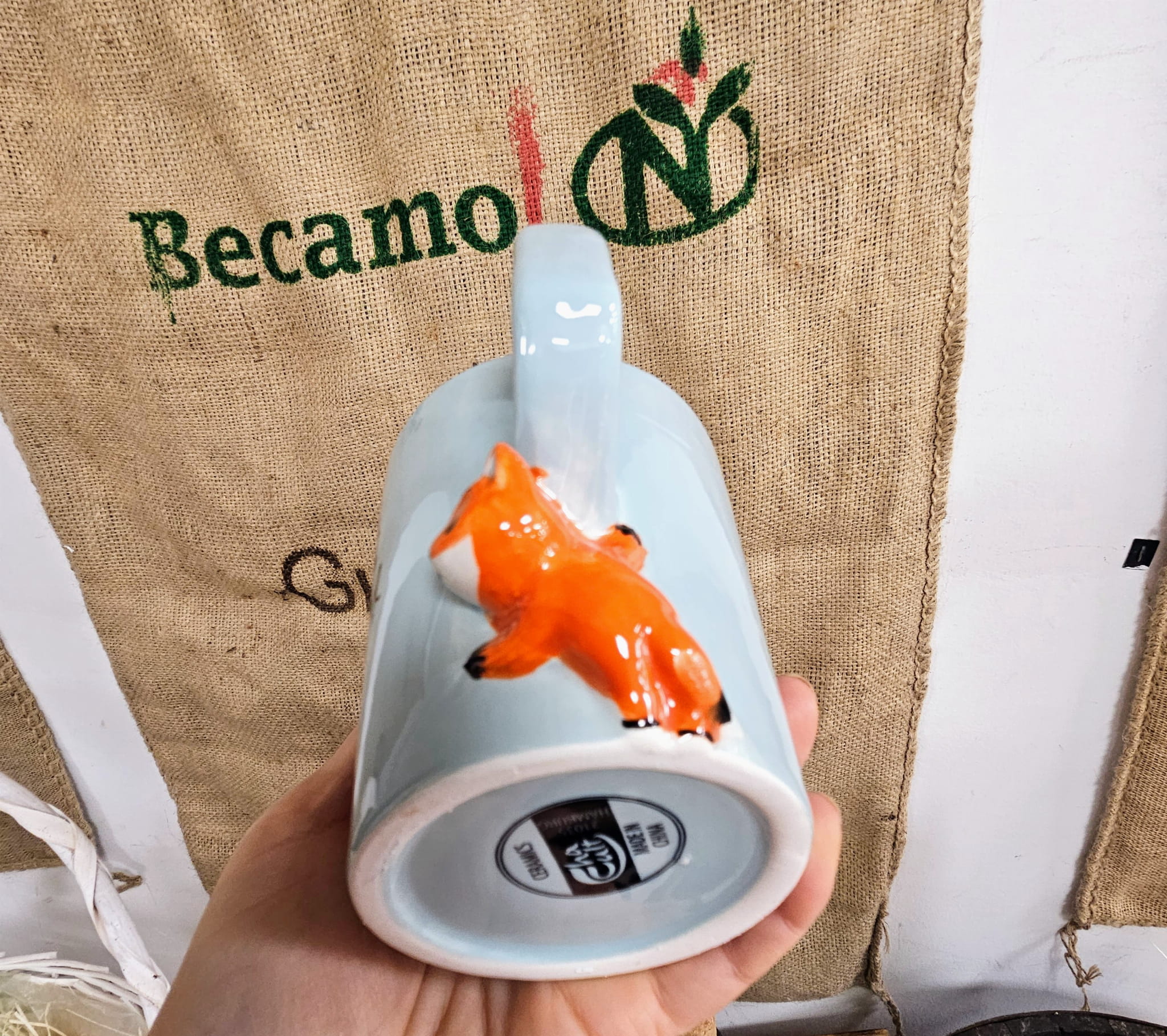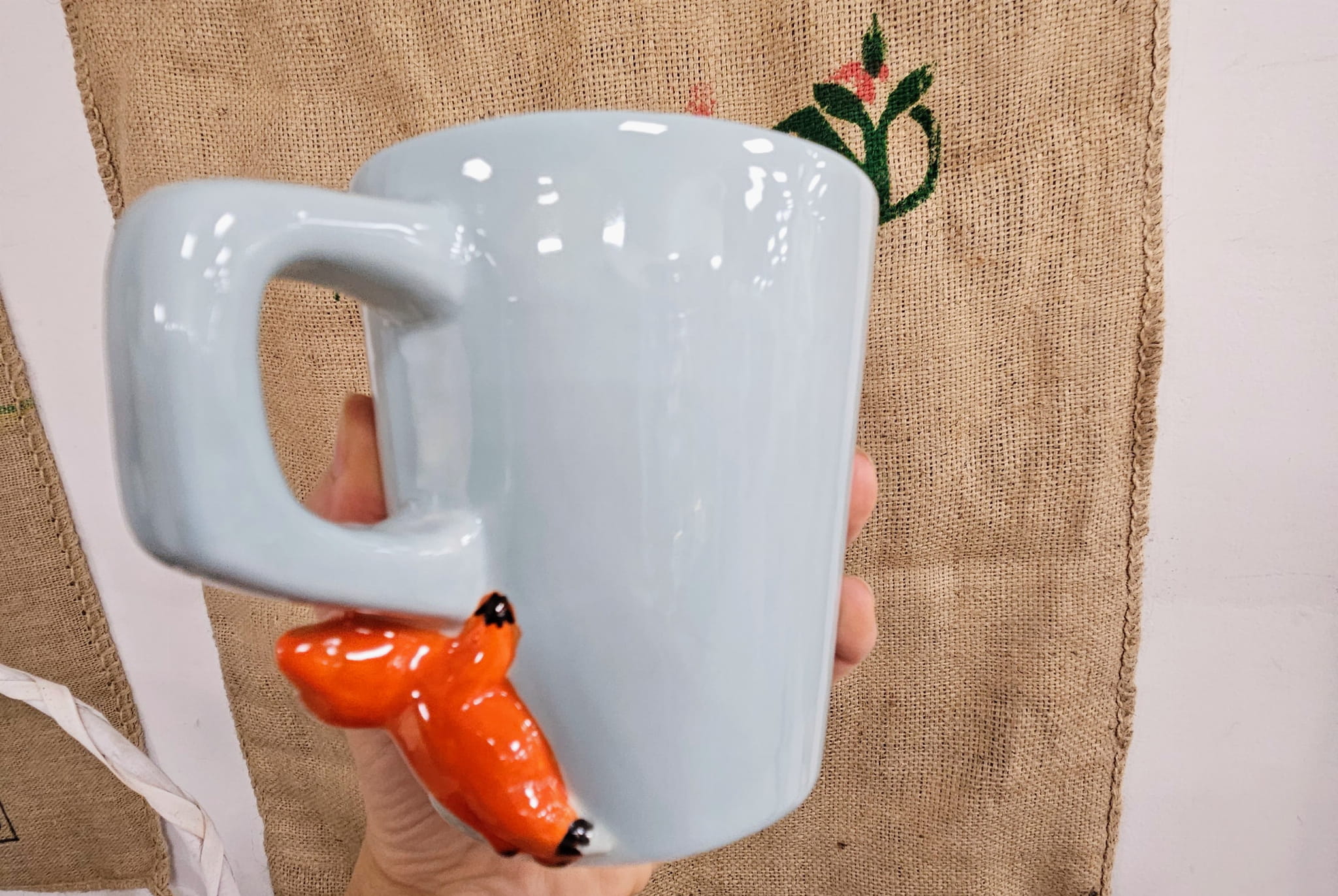 - Wzór: Kolor błekitny połysk na zewnątrz, wewnątrz biało - kremowy. Uszko lekko kwadratowe. poniżej uszka 3D porcelanowa mini figurka liska.