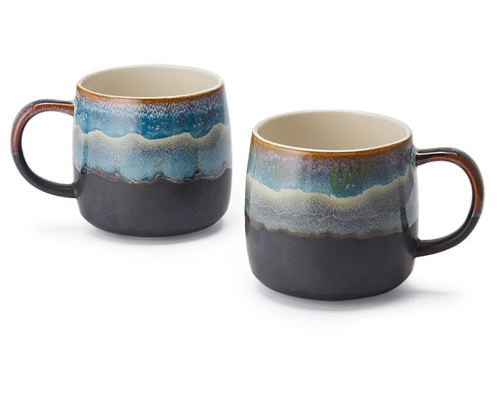 Ceramiczny kubek ręcznie malowany o pojemności 500 ml, wykończenie szkliwem reaktywnym w dwóch kolorystykach. Wnętrzne szkliwione w kolorze neutralnej złamanej bieli.