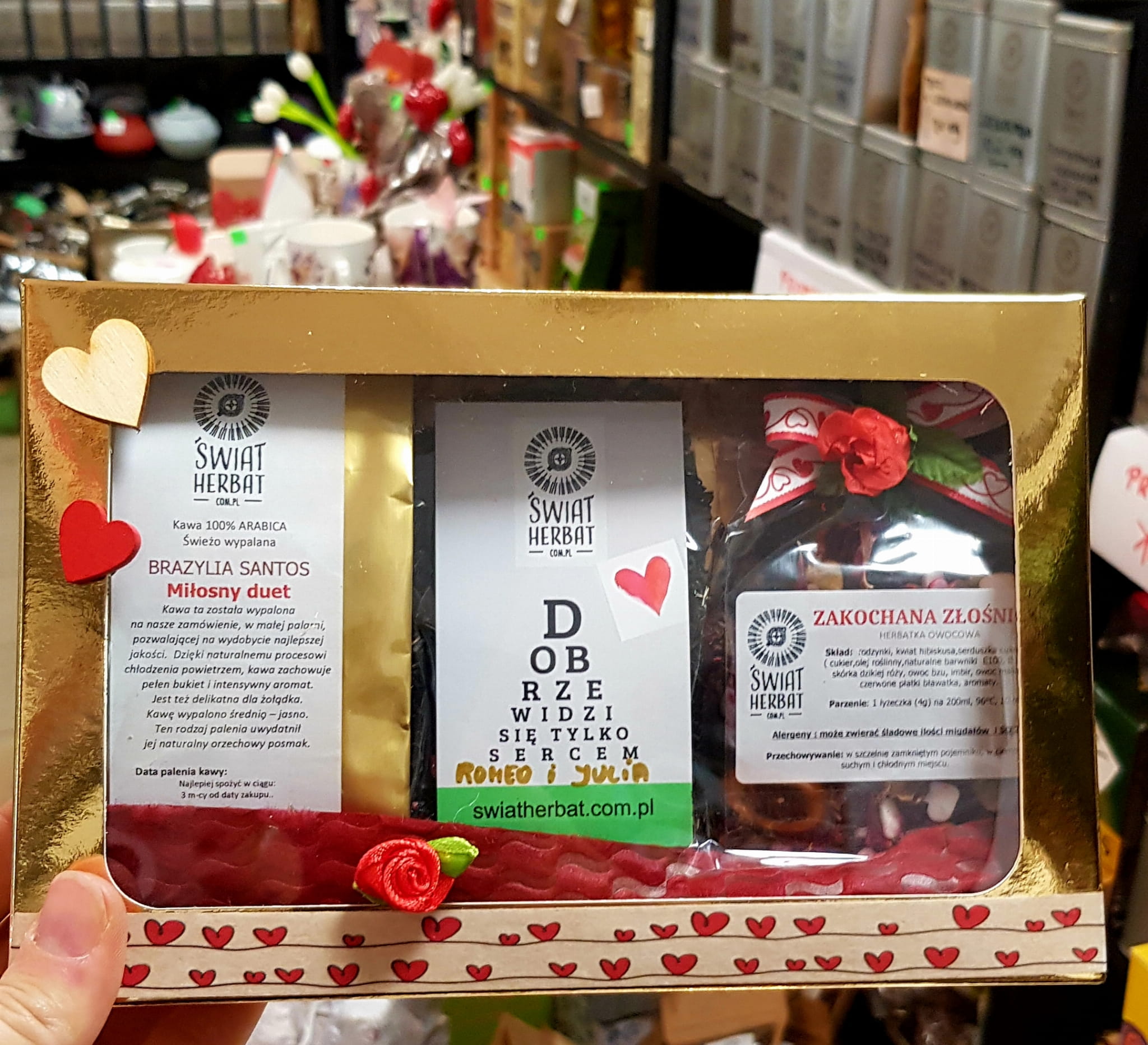 Walentynkowe, złote pudełko prezentowe z zawartością 2 rodzajów herbat i kawy z aktualnej oferty po 50g.