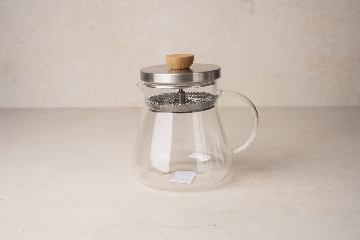 Tea Maker „Yorick” 0,7 l – szklany dzbanek z filtrem ze stali nierdzewnej, idealny do herbat liściastych. Minimalistyczny design i wygodne parzenie bez fusów w filiżance.