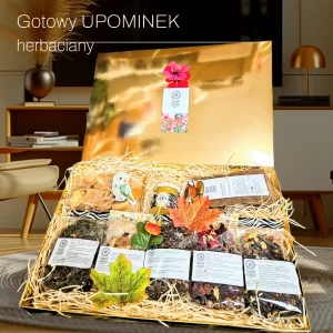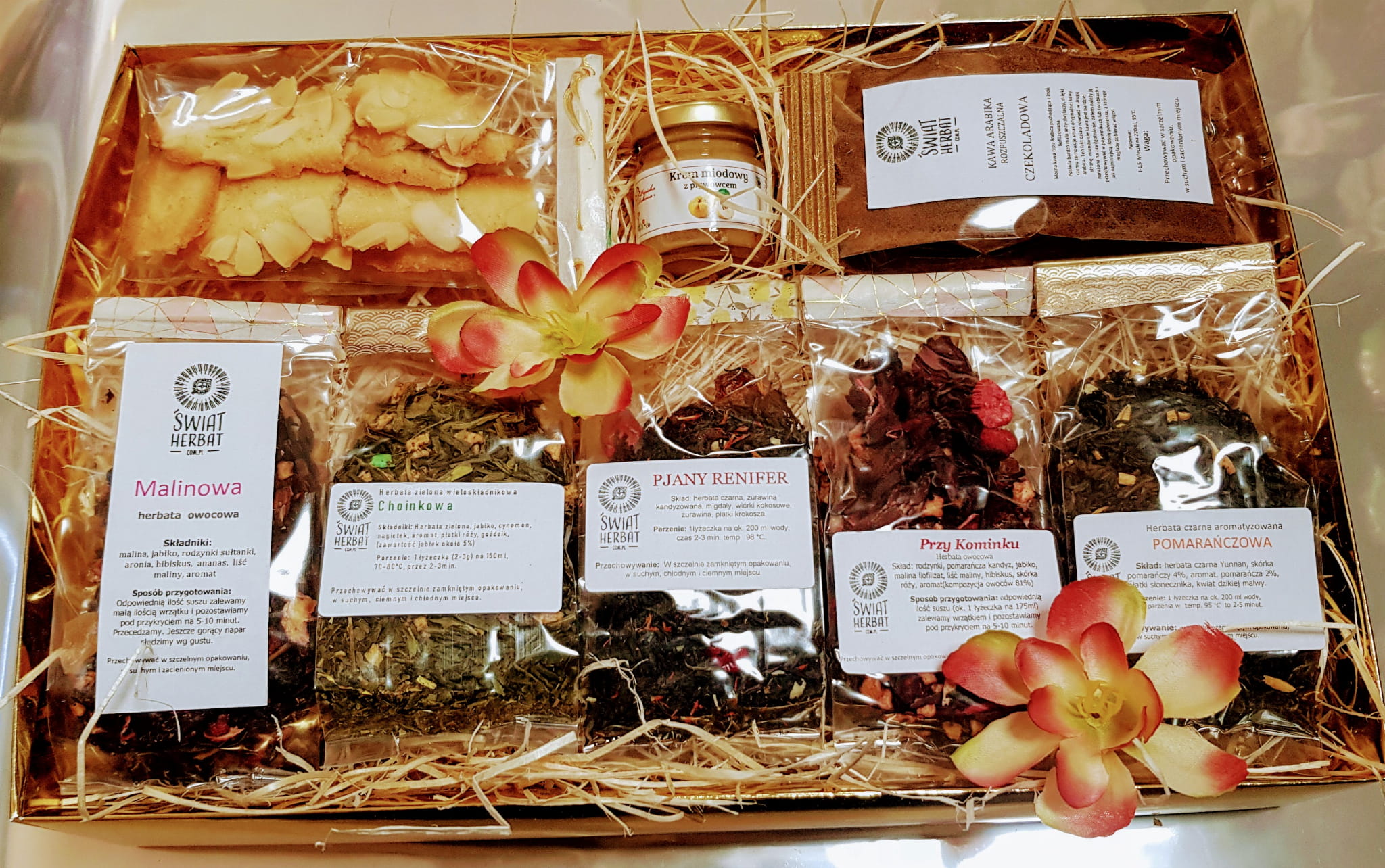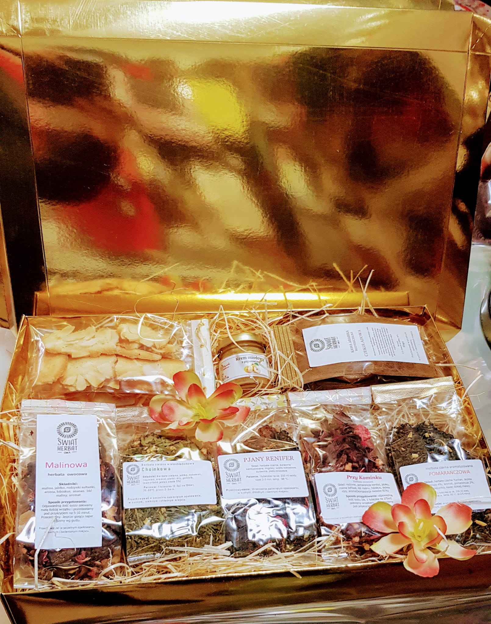 Gotowy zestaw prezentowy w złotym pudełku, zawierający 5 rodzajów herbat, plastry ósemki ananasa naturalnie suszonego, kawę rozpuszczalną i miodek kremowany.