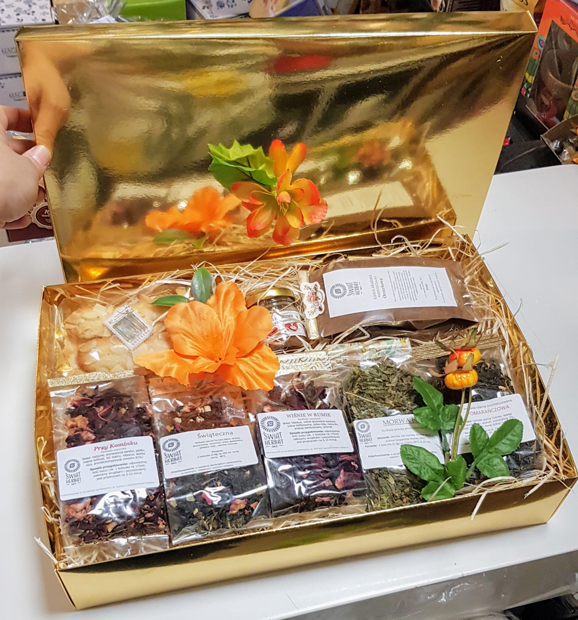 Zestaw 5 herbat, słodycze, miód i kawa - w złotym kartoniku