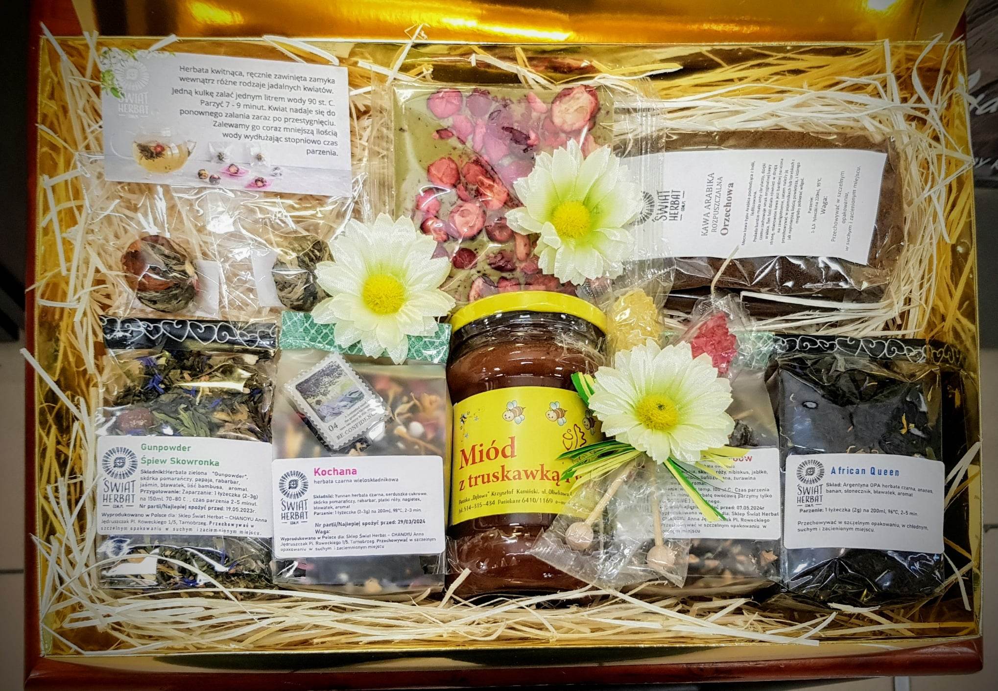 Zestaw miód + 6x herbata + kawa + czekolada w pudełku