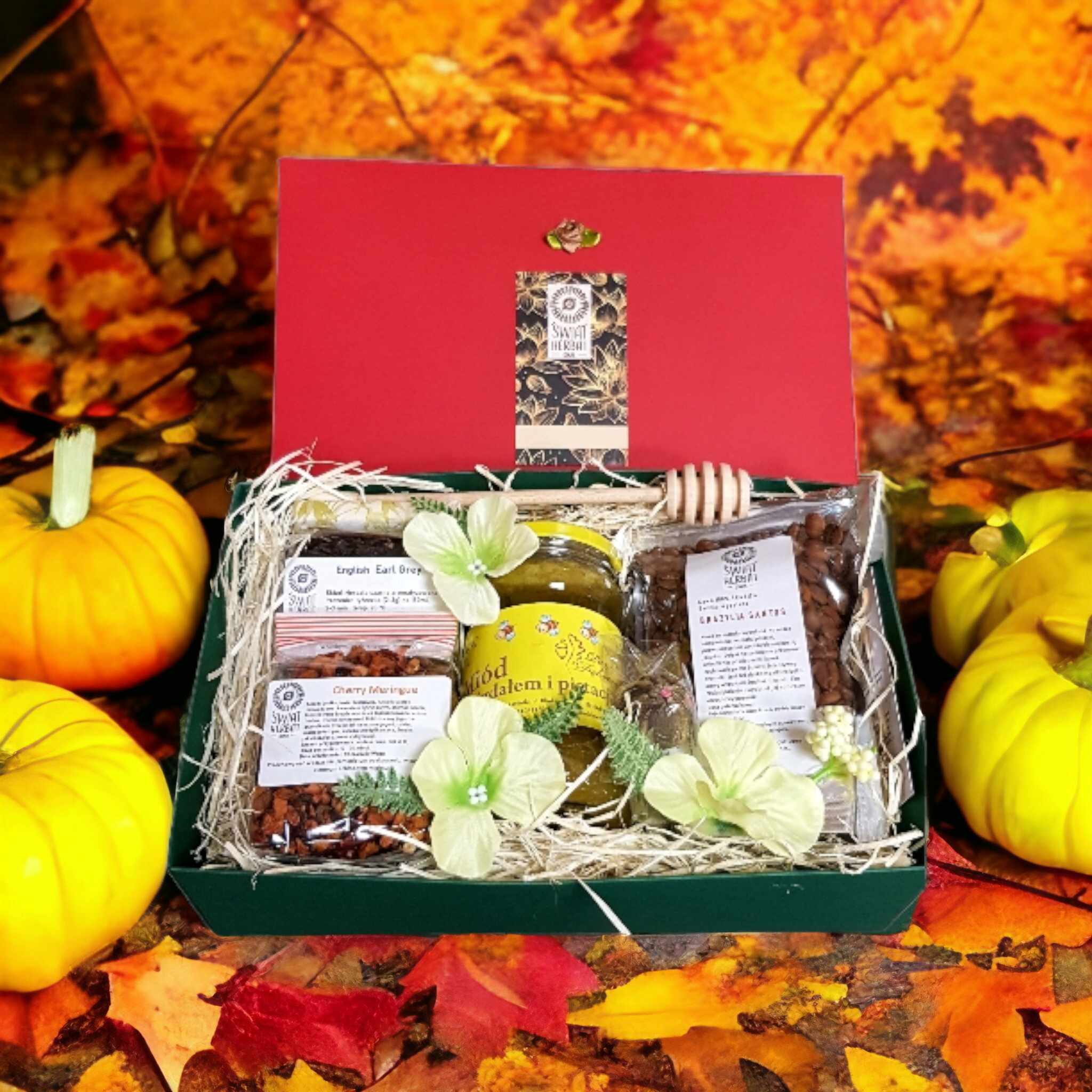 Gotowy do wręczenia zestaw z miodem kremowanym w bardzo eleganckim opakowaniu.